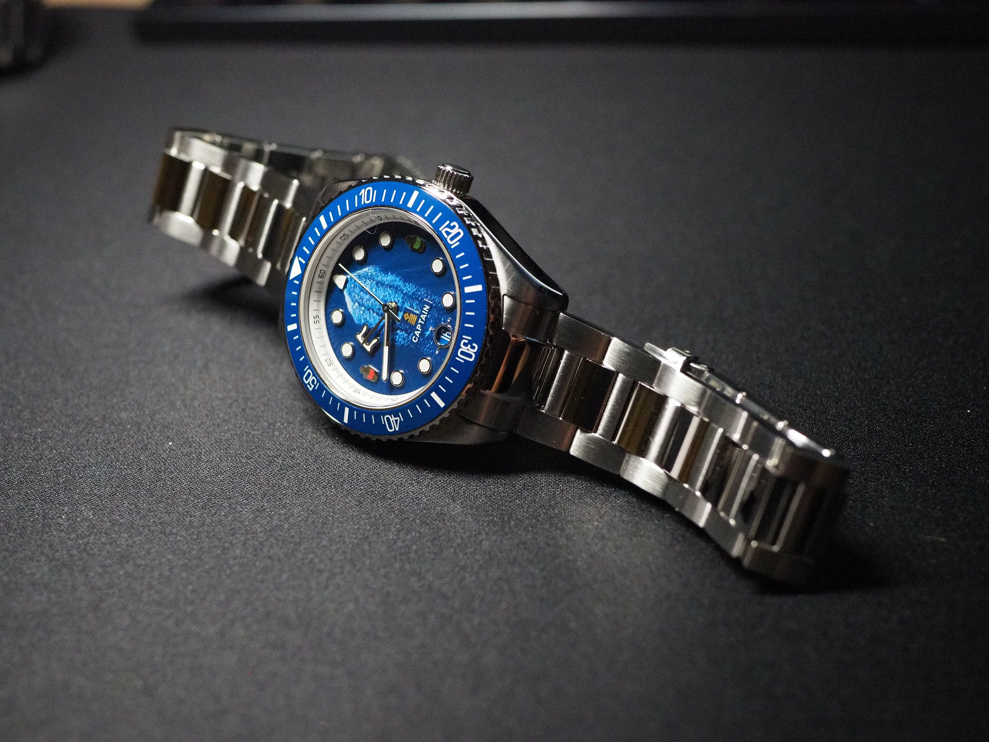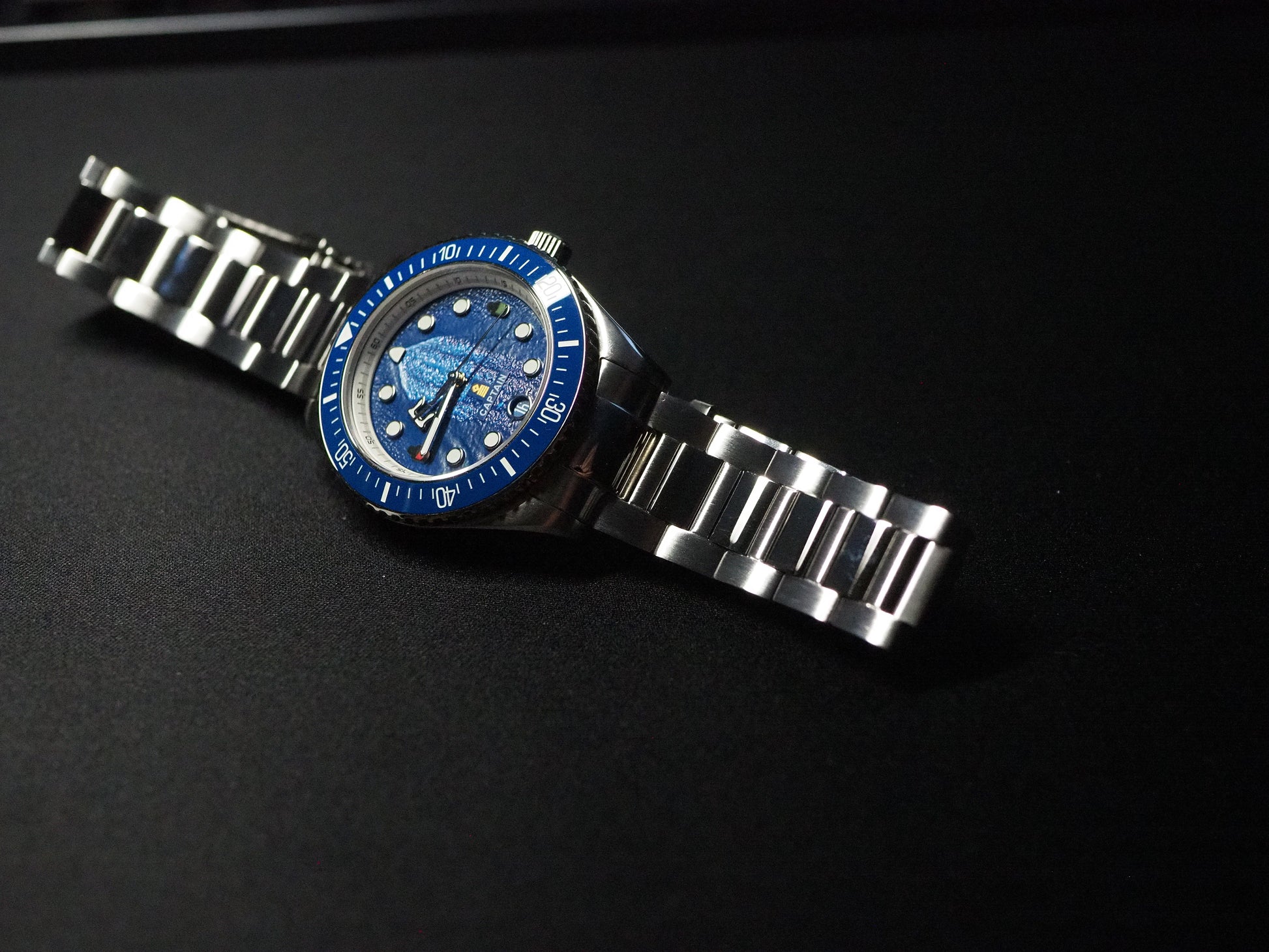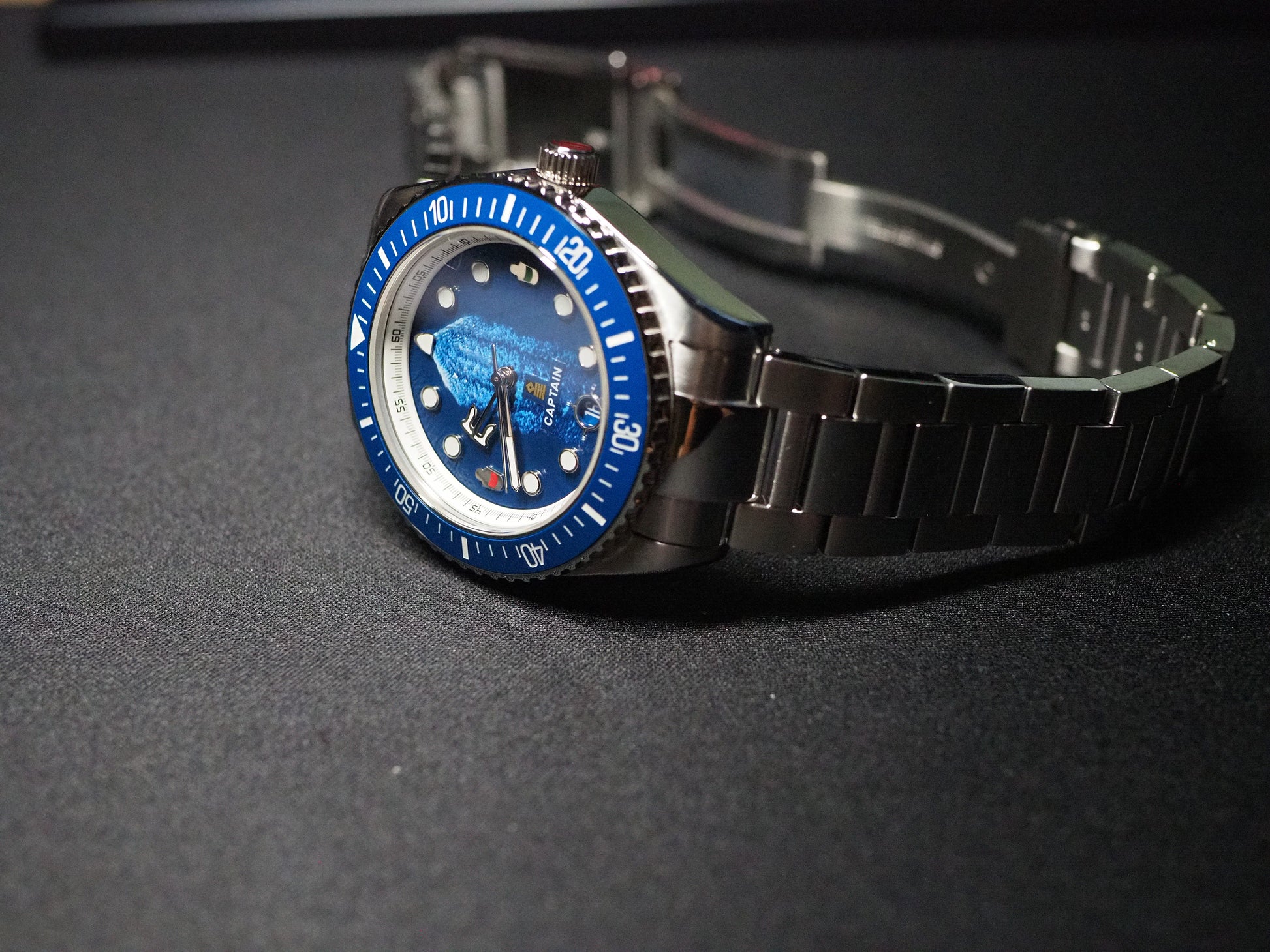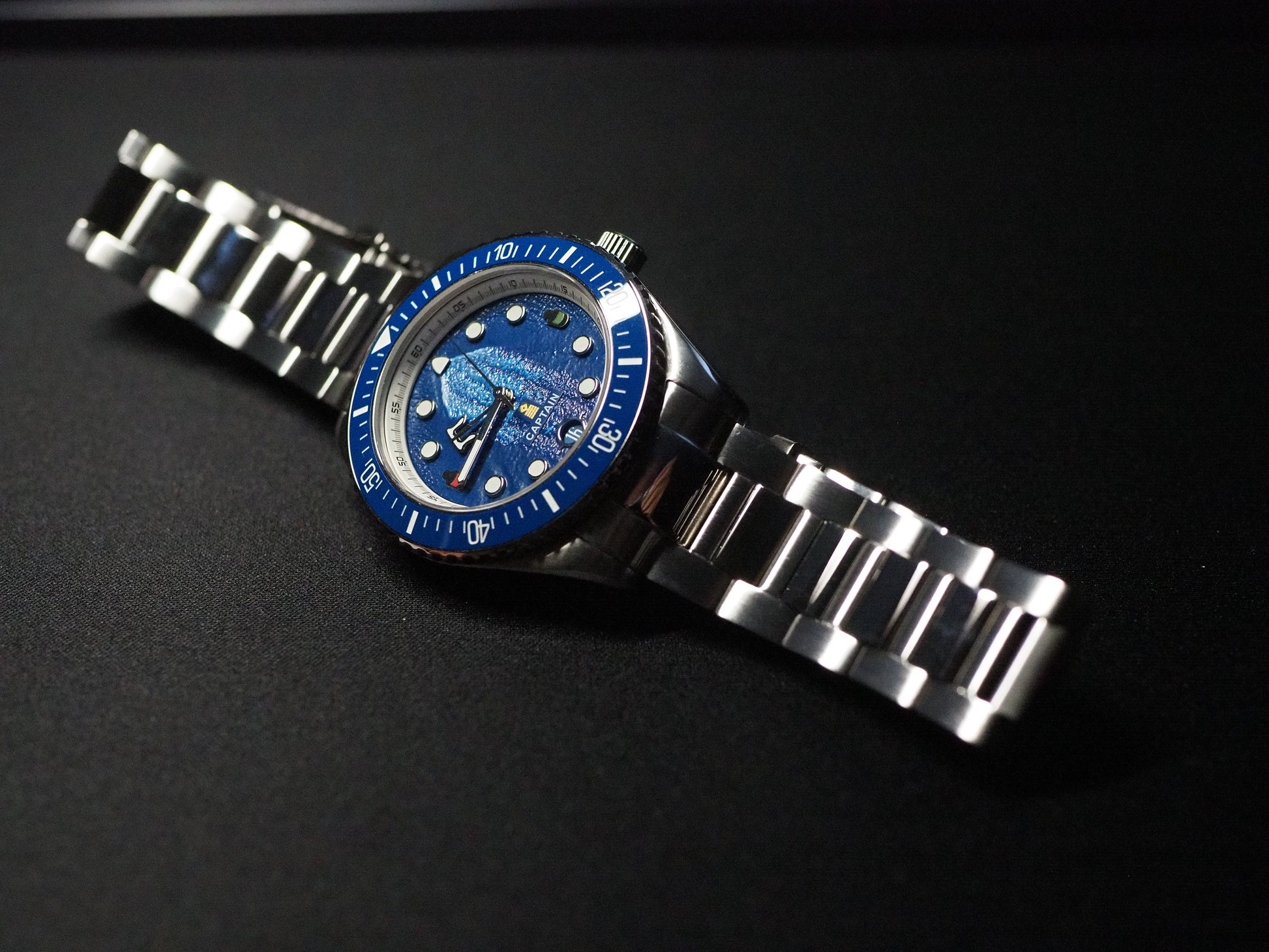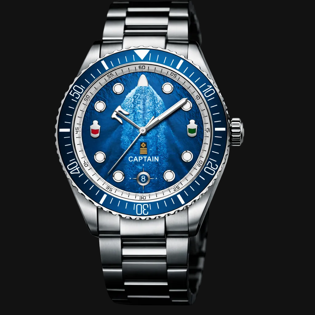 Timeviseren er formet som et skipsanker, og gir klokken et tydelig nautisk preg. På 3 og 9-tallet finner du skipslanterner, som symboliserer styrbord og babord. Tallskiven bærer mønsteret av kjølvannet som følger skipet gjennom bølgene – en påminnelse om bevegelse, fremdrift og frihet. Markørene rundt urskiven er inspirert av runde skipsvinduer, mens datovinduet er utformet som et kompass – alltid klar til å vise deg retningen.